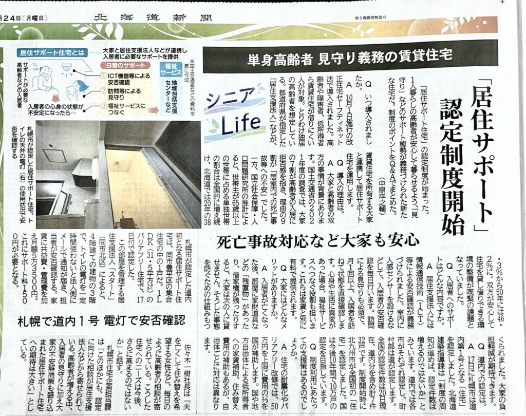 2025年11月24日の北海道新聞に、北海道1号となる「居住サポート住宅」の記事が掲載されました。